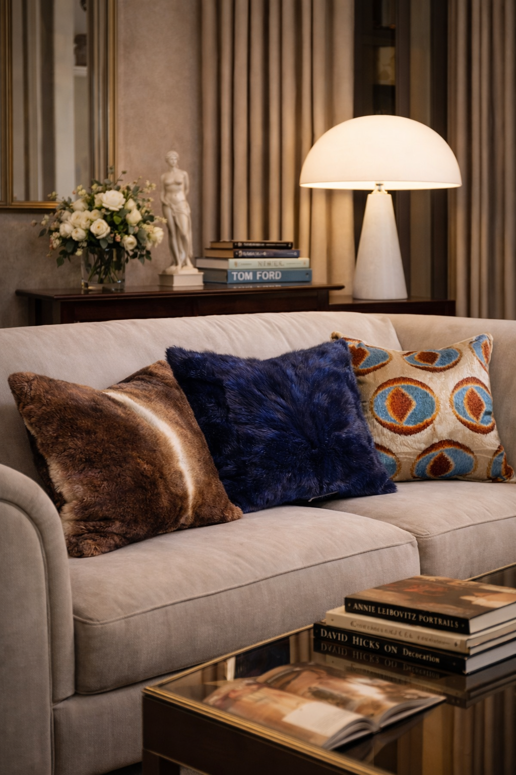 Questo cuscino nasce dall’incontro tra la pelliccia più preziosa al mondo e una seta Ikat artigianale, dando vita a un complemento d’arredo di assoluta esclusività.